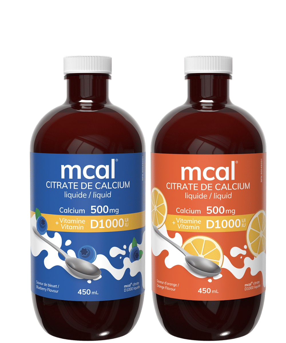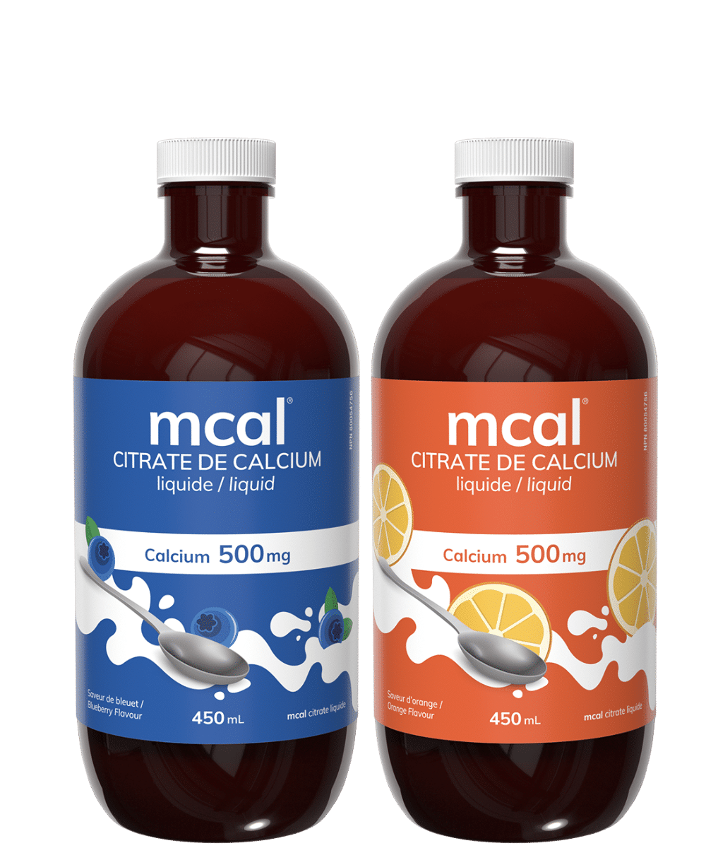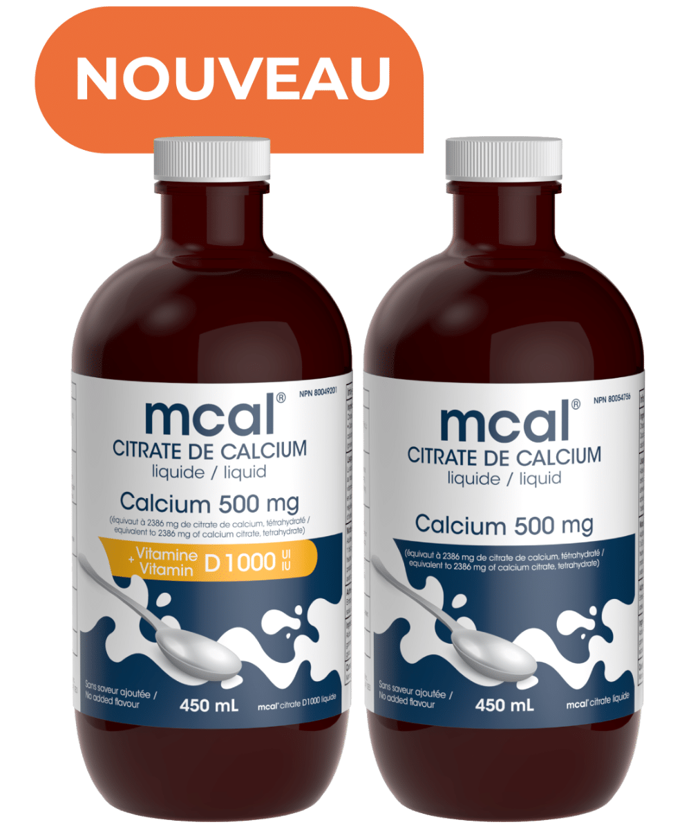 Ostéoporose Canada rappelle qu’à peine 10 %* des adultes de plus de 50 ans consomment assez de calcium dans leur alimentation. C’est pourquoi mcal offre une gamme complète de suppléments de calcium, disponibles avec ou sans vitamine D et sous forme de comprimés (carbonate) ou de liquide (citrate). Cette famille de suppléments a démontré son efficacité au fil des années et continue d’évoluer.
