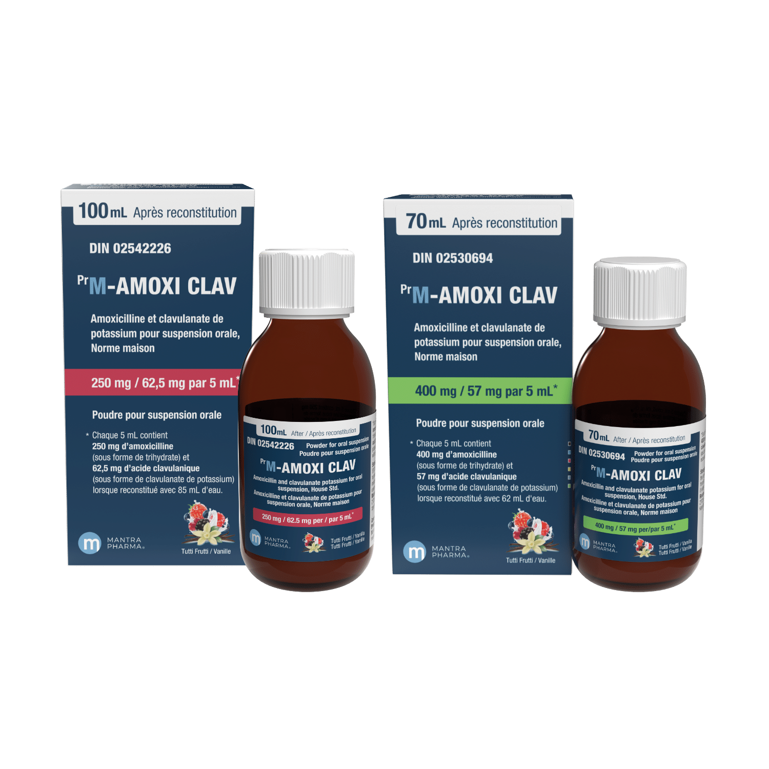 Suspension orale d’amoxicilline et d’acide clavulanique, en teneurs de 250 mg / 62,5 mg ou de 400 mg / 57 mg par 5 mL.